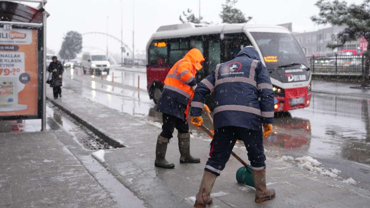 Düzce Belediyesi, gece saatlerinden itibaren etkisini artıran kar yağışına karşı tüm ekipleriyle sahada çalışmalarını sürdürüyor.